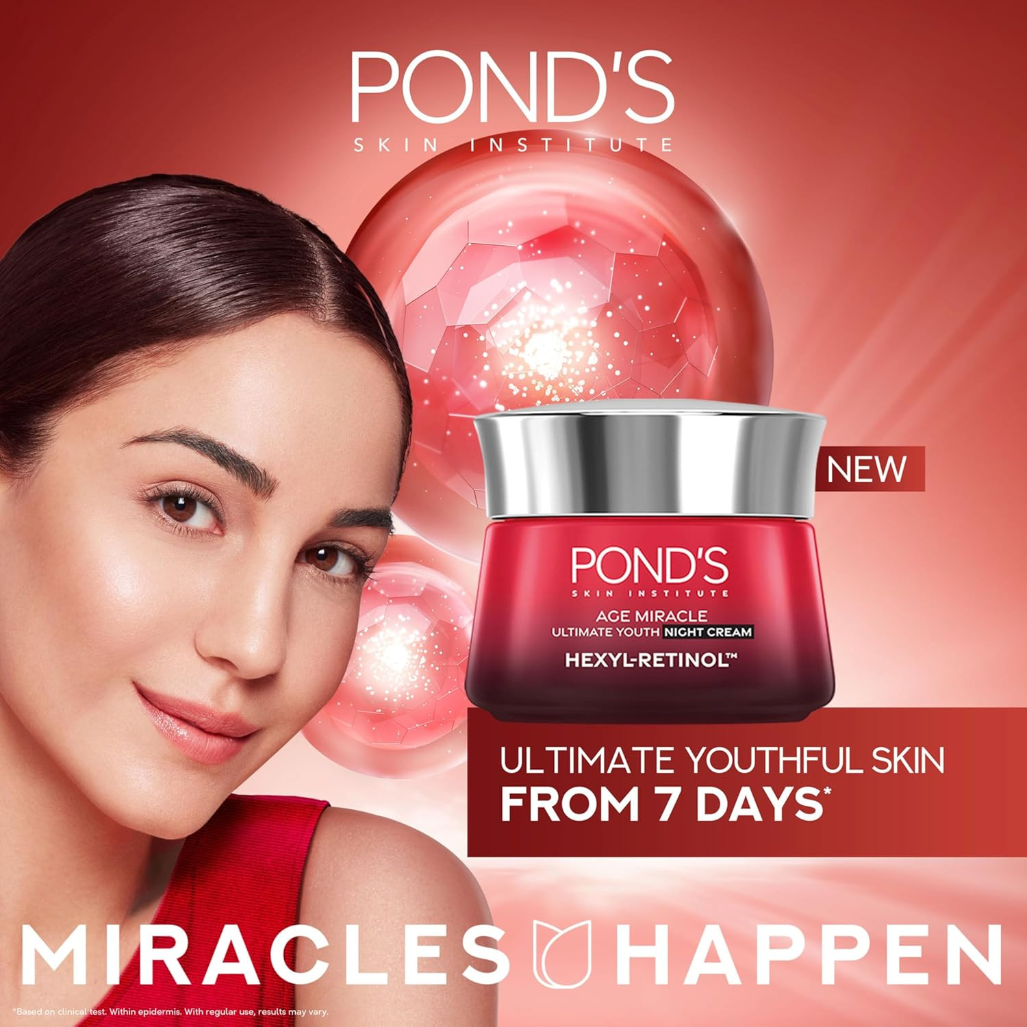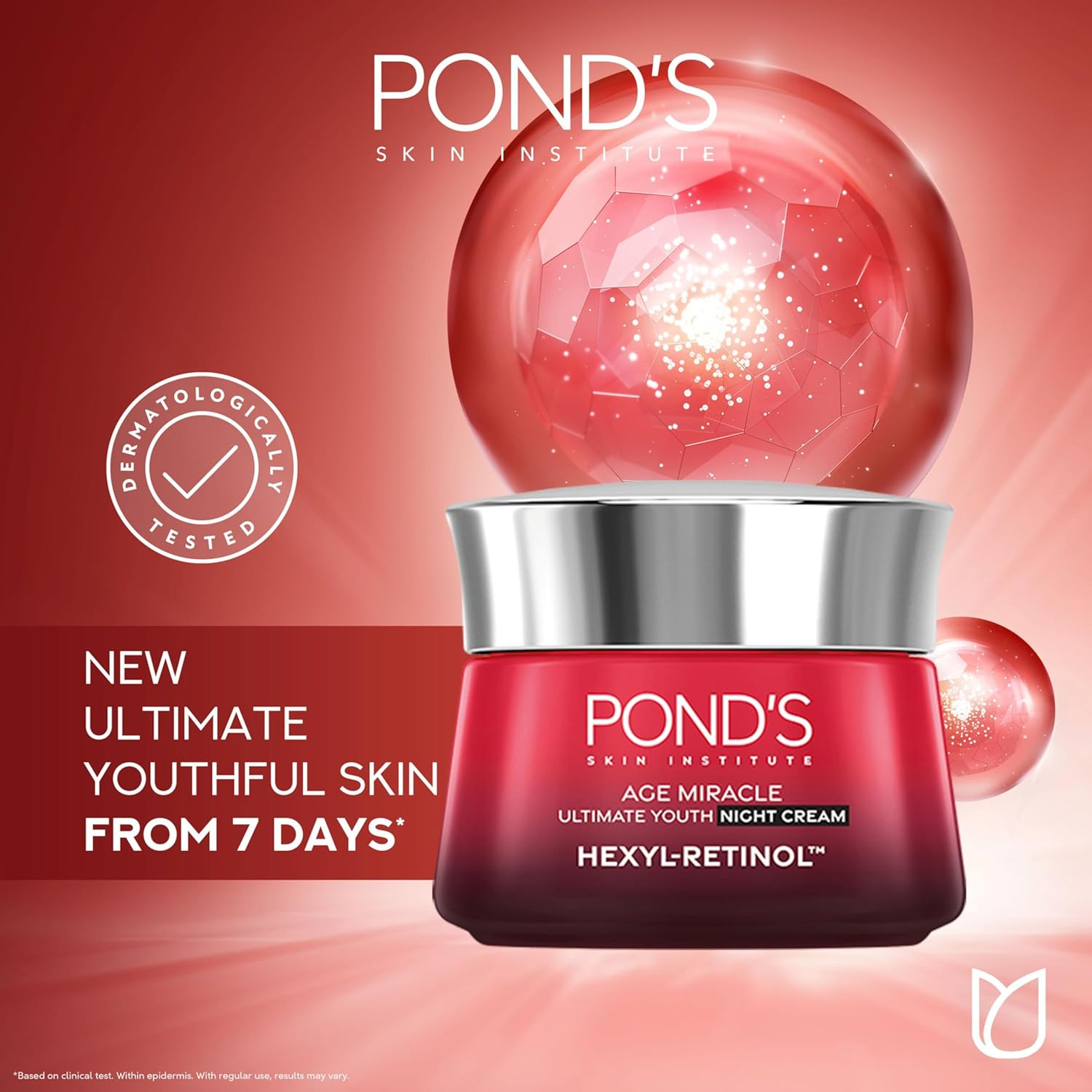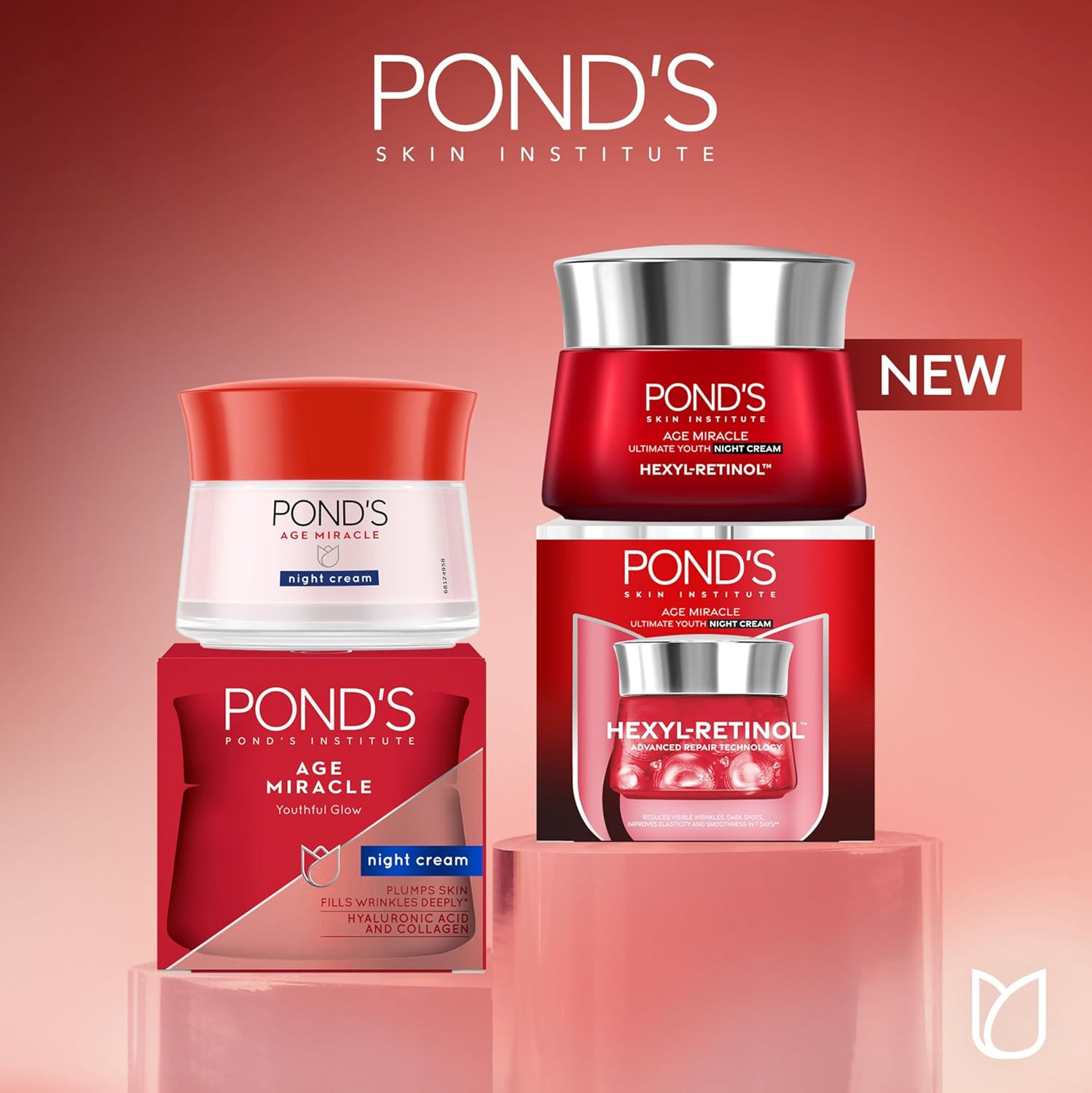 Your skin loses 1% of its collagen every year, causing it to sag and lose its youthful appearance. With Pond's Age Miracle Anti Wrinkle Night Cream, you can get smooth, bouncy, youthful-looking skin as you sleep. The Pond's formula is made to deeply moisturize and fight wrinkles overnight, so you can wake up to radiant-looking skin. Pond's night face cream moisturizer is infused with Hya-Collagen B3 Complex to plump up skin and fill in wrinkles. It replenishes moisture from within and outside the skin with hydrating 4D hyaluronic acid, while Niacinamide strengthens the skin barrier. Pond's has also added Retinol-C, which works non-stop for 24 hours to help reduce wrinkles and fine lines. This non-greasy cream melts into your skin to renew your skin texture and reduce wrinkles in 7 days*, leaving it looking smooth and feeling soft and moisturized. Pond's anti wrinkle night cream also contains antioxidant vitamin E acetate. This nourishing anti aging Youthful Glow Night Cream has been developed to feed your skin as you sleep. Apply it every evening after your cleansing and serum routine for a firmer, more even toned skin with a youthful glow *With continued use as part of the Pond's Age miracle regime.