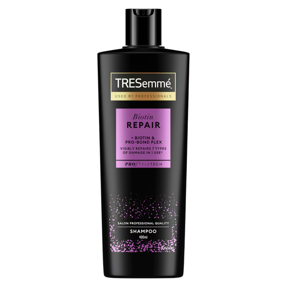 Take control of healthy-looking hair! Fight and prevent damage with our products. TRESemmé Biotin Repair line features Pro-Bond Plex™ and Pro Style Technology, a formula with amino acids and ceramides, and our salon-inspired shampoo leaves hair smooth, manageable and easy to style with continued use. TRESemmé Biotin Repair Shampoo helps repair hair and helps protect against 7 types of styling damage* from the first use. TRESemmé is proud to be a PETA (People for the Ethical Treatment of Animals) approved hair care brand. Ingredients Biotin - known to help with the overall condition and strength of hair *The 7 types of damage: blow-drying, bleaching, combing, straightening, coloring, braiding and curling are visibly improved when used together with Biotin Repair shampoo and hair conditioner.