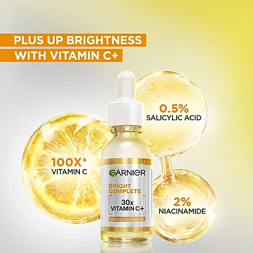 Revitalize your skin with Garnier's Bright Complete Vitamin C Booster Serum, a powerful and concentrated brightening formula that instantly combats dullness and reduces the appearance of dark spots. Enriched with 30 times the Vitamin C found in Garnier's Bright Complete face creams, as well as nourishing ingredients like Niacinamide and Salicylic Acid, this lightweight and non-oily serum penetrates deeply to deliver a radiant, refreshed glow. Suitable for all skin types, from oily to dry, simply cleanse your skin, apply 3-4 drops evenly over your face and neck, and gently tap it in. Use twice daily, followed by your favourite moisturising creams, for best results. Experience fast and visible improvements in your skin's brightness and clarity with this potent Vitamin C-infused serum.