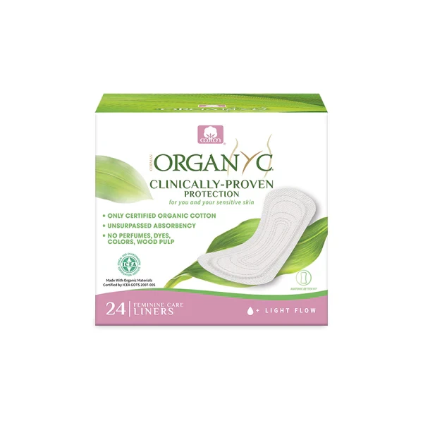Organyc 24 Panty Liners are feminine hygiene products suitable for sensitive skin, designed for light flow. They feature:
