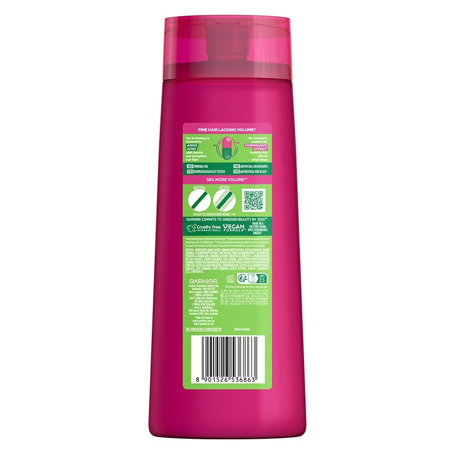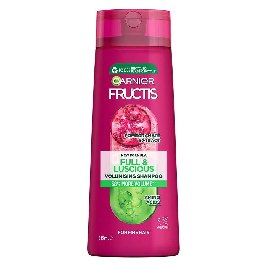 Boost volume and strength with Garnier Fructis Full & Luscious Shampoo. Our Amino Acid-powered technology adds density to fine hair, while Pomegranate Extract hydrates without weighing it down. Our formula is mineral oil-free, artificial colorant-free, dermatologically tested, and pH neutral for the scalp. Experience 58% more volume** with Garnier Fructis. Try it today! **Instrumental test after application of shampoo & conditioner.