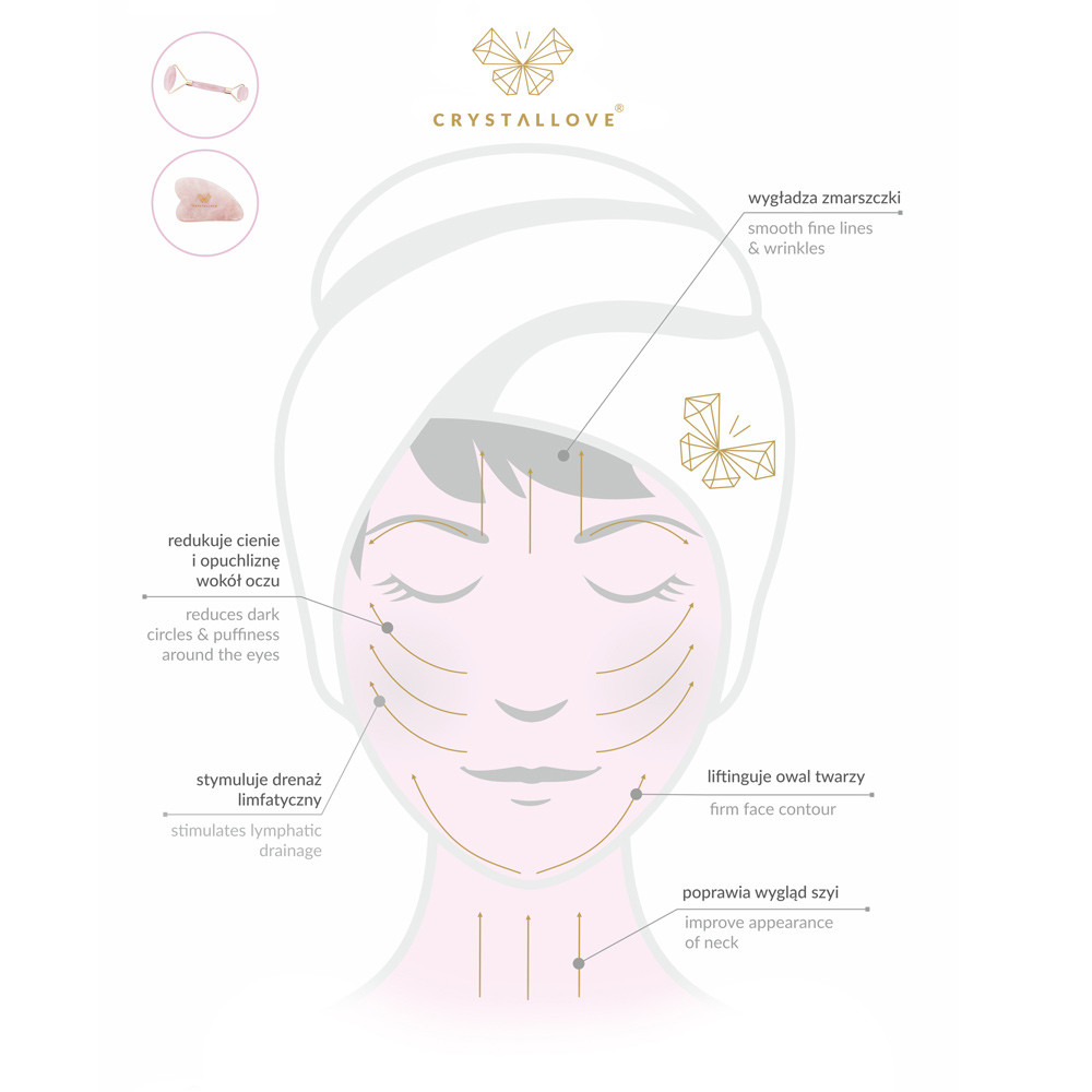 Create your own beauty ritual with the luxurious CRYSTALLOVE facial massage products. The face massage set, inspired by the extraordinary properties and beauty of rose quartz, is based on the best natural products that provide a unique atmosphere at home SPA. It consists of 2 main products of the brand: face roller and gua sha face massage plate. The set has been enriched with a glass bottle for oils, which contains a ball massage tip made of rose quartz, inside there are crystals so that your oil will be saturated with the valuable energy of stone. The set looks beautiful, which is why it is also a perfect gift idea.