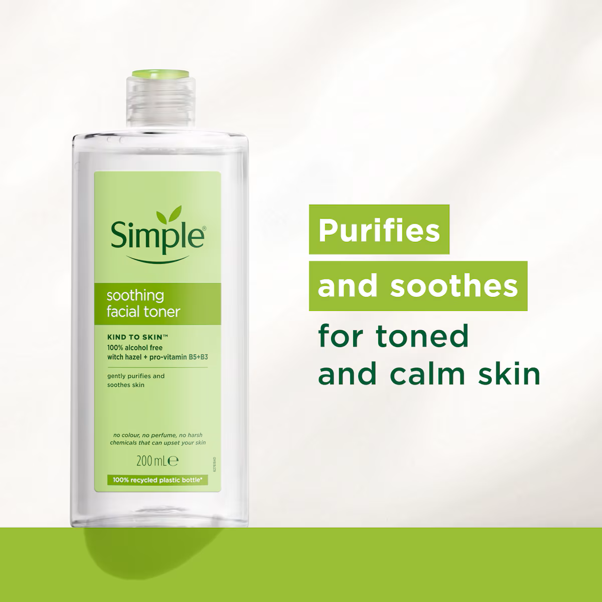 Our Simple vegan facial toner removes any alkaline residue left after cleansing, helping restore the balance to your skin's natural pH level. Great for sensitive skin. Did you notice that this bottle is a little greyish? It’s because it's made from 100% recycled plastic!