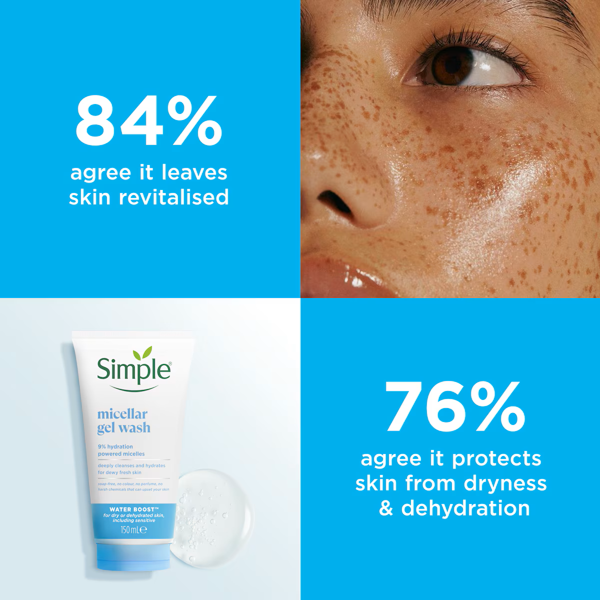 Simple Water Boost Micellar Facial Gel Wash, a new generation face wash that delivers instant hydration and gentle yet effective cleansing. Lightweight on your skin, the micellar cleansing bubbles glide over your face, attracting make-up and dirt while leaving skin instantly refreshed.