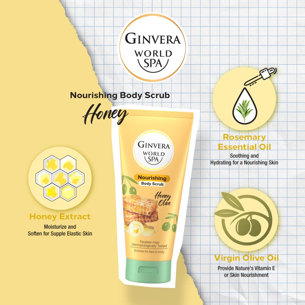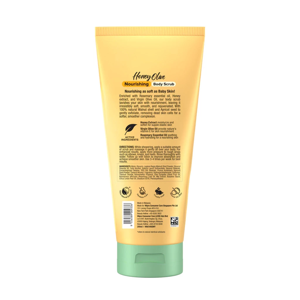 Nourishing as soft as Baby Skin! Enriched with Rosemary essential oil, Honey extract, and Virgin Olive Oil, our body scrub lavishes your skin with nourishment, leaving it irresistibly soft, smooth, and rejuvenated. With 100% natural walnut shell and apricot seed to gently exfoliate, removing dead skin cells for a softer, smoother complexion. Gentle scrub for instant skin nourishing. Dermatologically Tested, suitable for face and body.